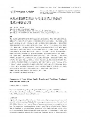 目的:比較視覺虛擬現(xiàn)實訓練與傳統(tǒng)訓練方法治療兒童弱視的療效.方法:前瞻性隨機對照試驗.選取2018年6月至2019年12月于武漢大學中南醫(yī)院確診的并首次接受治療的3~12歲弱視患兒90例(1